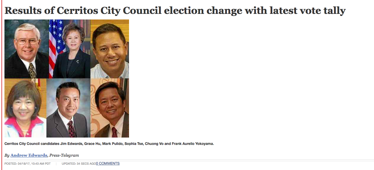 Screen shot from LBPT’s website that claimed Jim Edwards, Mark Pulido and Sophia Tse were City Council candidates. Edwards and Pulido’s terms end in 2019, Sophia Tse did not campaign during the election. The picture left out other candidates including up-and-comer Anantha Ramachandran.