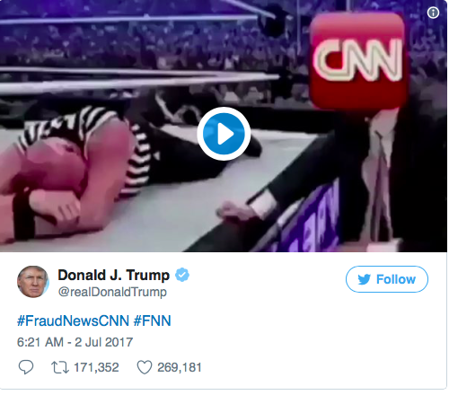 President Donald Trump took his self-declared war against the media in general, and CNN in particular, to a disturbingly childish place on Sunday morning as he tweeted a video showing him body-slamming, choking, and just generally beating up someone with the CNN logo superimposed on his head. The video was a crude edit from a 2007 Trump appearance at a World Wrestling Entertainment event and it had been recently posted on infamous pro-Trump subreddit The Donald. The person whose face is covered by the CNN logo in the edited video is WWE Chairman Vince McMahon (his wife, Linda, is head of the Small Business Administration).