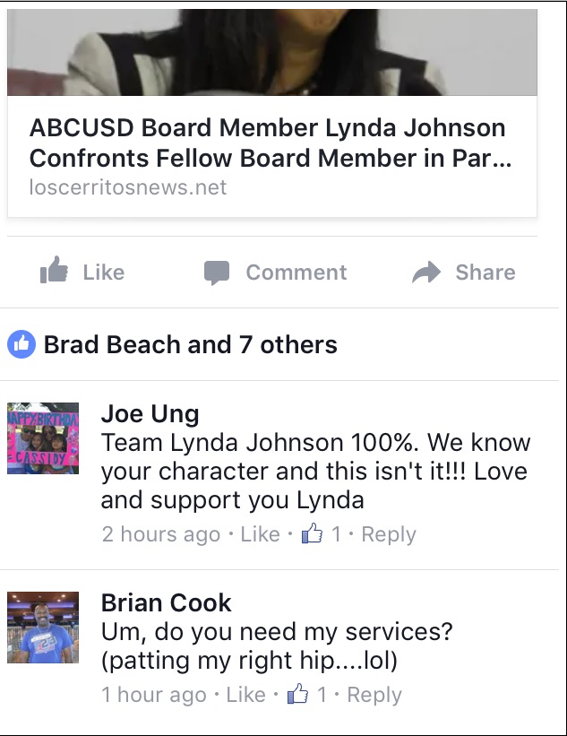 Immediately below a “like” of the post by Cerritos resident Brad Beach, an avid supporter of both Johnson and Melinda Kimsey and who’s mother, an apppointed Cerritos Commissioner, works for Kimsey for no pay, was a comment from Brian Cook, a friend of Johnson’s.