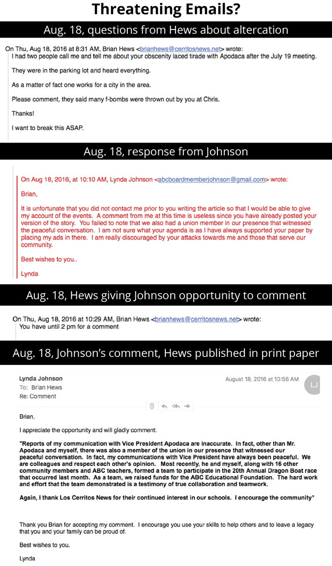 The emails were related to an altercation Johnson had with then ABC Vice President Chris Apodaca in the district parking lot after a Board meeting.