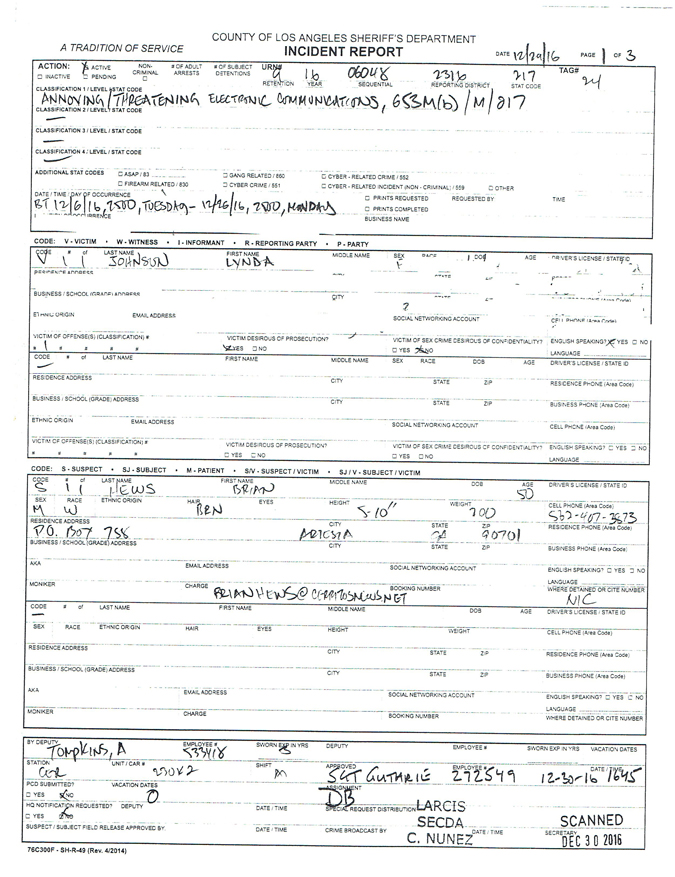 Approximately one month after Johnson filed the second report, a detective at the Cerritos Sheriff Station left a voice mail for Hews about “an criminal incident filed against you.”