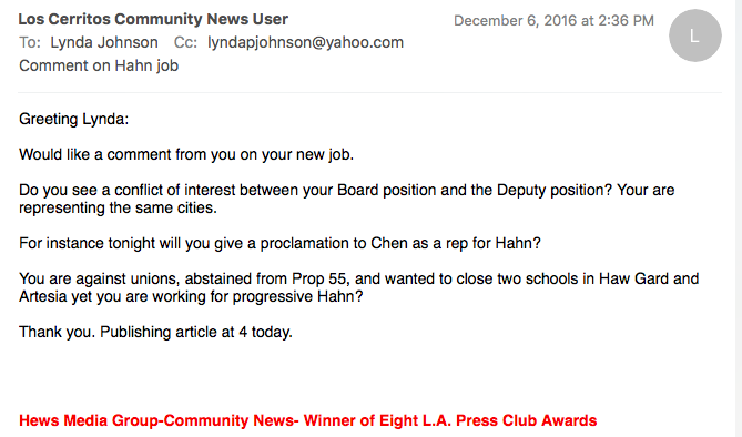 Later, HMG-CN exclusively obtained the opinion from ABC’s law firm that said Johnson was in violation of Government Code 1126 and should either resign her ABCUSD Board position or quit her job with Supervisor Hahn.