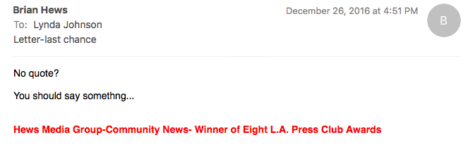 Hews wrote, “I have the Dec. 22 opinion letter, would you like to provide me with a quote? Publishing later today. Brian.”