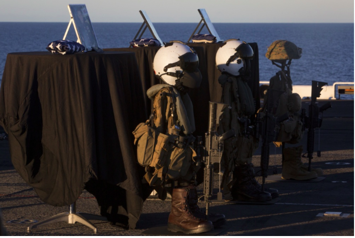 The Marines and Sailors of the 31st Marine Expeditionary Unit and USS Bonhomme Richard (LHD 6) Expeditionary Strike Group joined together to honor and remember 1st Lt. Benjamin Cross, Cpl. Nathaniel Ordway and Pfc. Ruben Velasco during a moving sunset memorial aboard the Bonhomme Richard, Aug. 9, 2017.