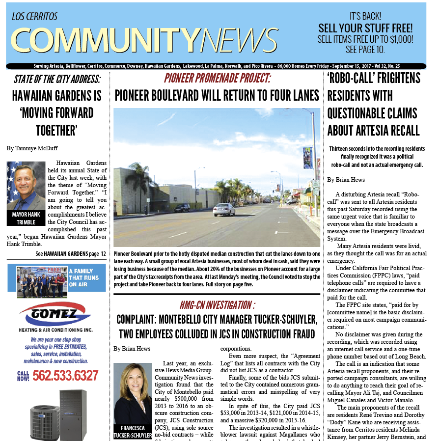 Sept. 15, 2017 Hews Media Group-Community News Front Page Preview