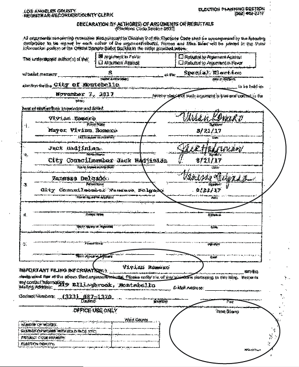 Now, on the heels of the JCS controversy, HMG-CN has learned that Montebello Mayor Vivian Romero submitted questionable declarations related to the Montebello Measure S tax increase to the City Clerk, which the City Clerk subsequently filed.