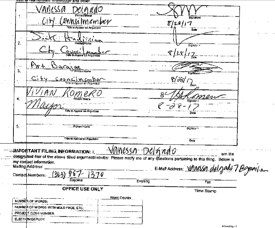 Arguing for a tax increase, the document was signed by Romero, and Council-persons Jack Hadjinian and Vanessa Delgado.