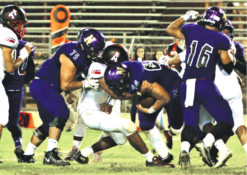 Norwalk High senior Etieni Valele muscles his way for some yardage in last Friday’s 63-14 win against Artesia High. Valele gained 21 yards on seven carries and scored on a three-yard run in the third quarter. PHOTO BY ARMANDO VARGAS, Contributing photographer.