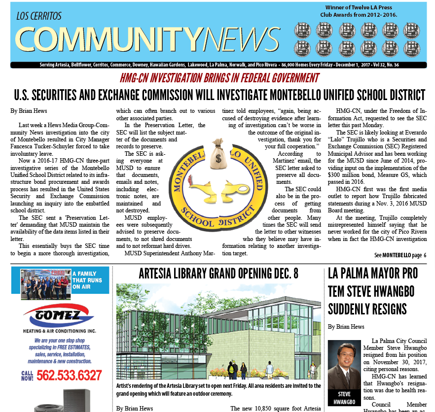 December 1, 2017 Hews Media Group-Community News Front Page Preview