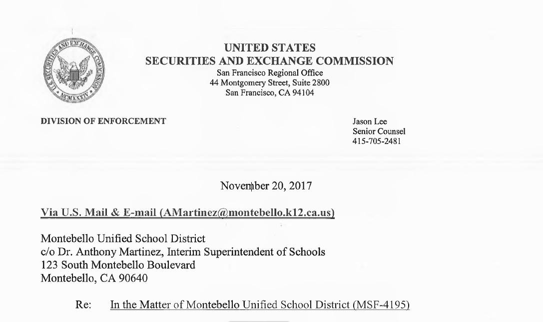 The letter was sent to interim Superintendent of School Anthony Martinez from the SEC’s San Francisco Regional Office, dated November 20, 2017, and signed by special counsel Jason Lee.