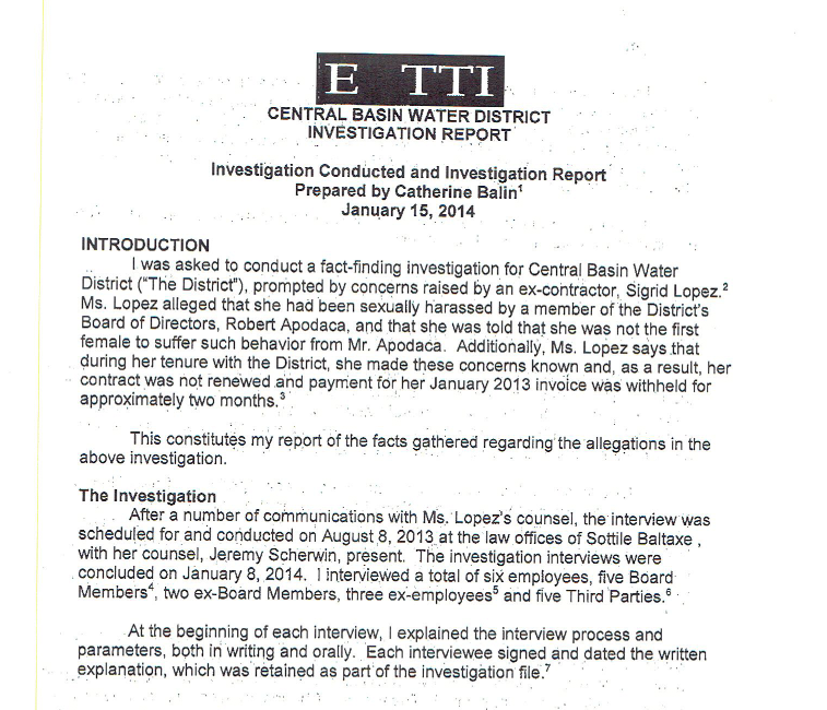 In September of 2014, Hews Media Group-Community News exclusively obtained an agreement between Sigrid Lopez (Lopez) and Central Basin Municipal Water (CB) that used $670,000 in taxpayer funded dollars to settle a 2013 sexual battery and harassment lawsuit filed against current CB Board President Bob Apodaca.