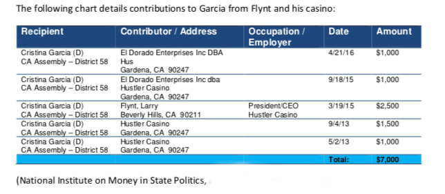 Data from the National Institute on Money in State Politics showing Flynt donations to Asm. Garcia