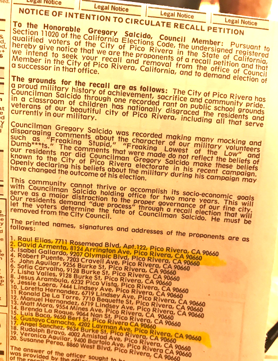 And now, in a seeming exchange for the Bobadilla vote, Armenta is backtracking on his efforts to recall Salcido and he is leaving Pico Rivera Veterans in the lurch.