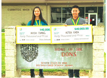 SURPRISE: Fu-Tung ‘Irisa’ Chang and Peter Chea, from Cerritos High School with scholarship checks given to them during their Model United Nations class.