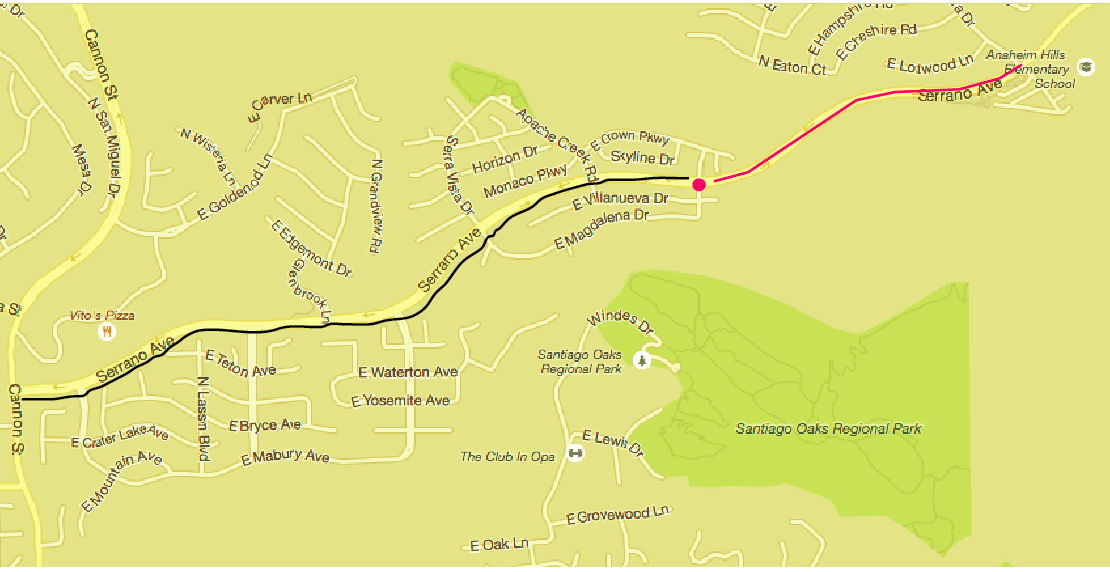 Serrano Ave. from Imperial/Cannon (bottom left) up to Nohl Ranch Road (top right). Drivers are routinely seen speeding especially in the red area. One motorcycle officer told Hews a few weeks ago he caught a driver traveling at 73 mph. He was clocking drivers at the same intersection the accident occurred.