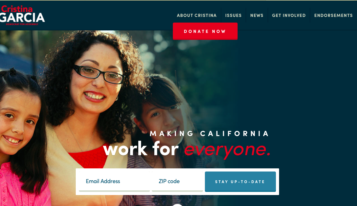 The bottom of the TeamCristinaGarcia.com has the proper paid for by disclosure which reads, “Paid for by Cristina Garcia for Assembly 2016, FPPC# 1373564.