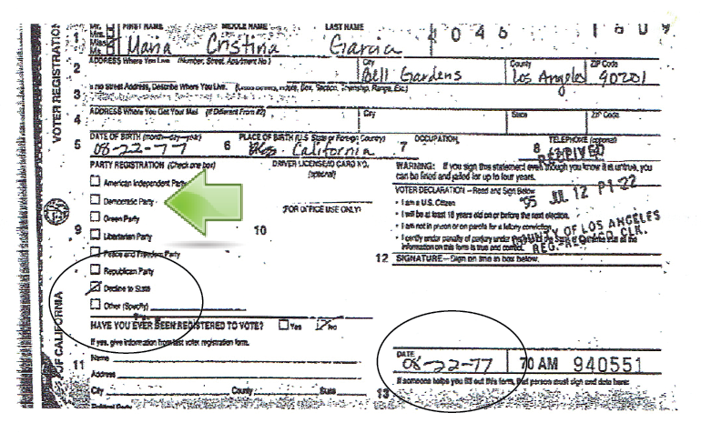 Document showing Garcia’s registration when she was eighteen years old as Decline to State.