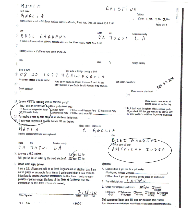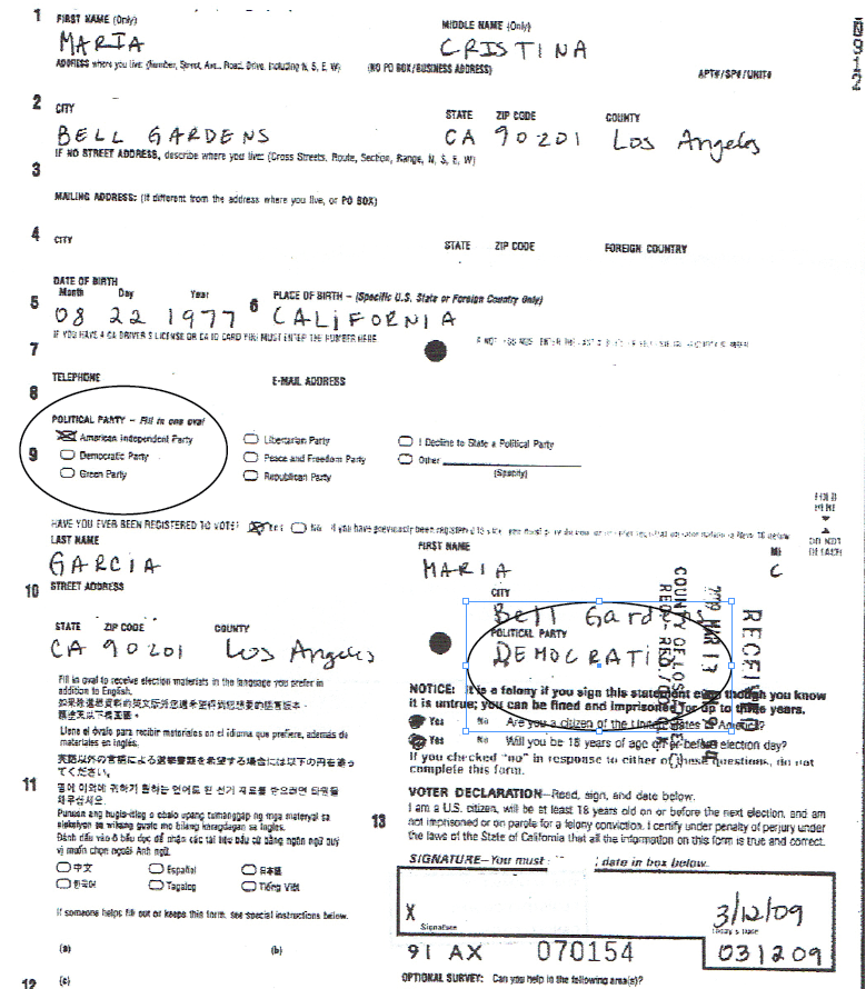 Document showing Garcia registering as a Democrat in 2010. The lower circle shows she confirmed she was with the American Independent Party.