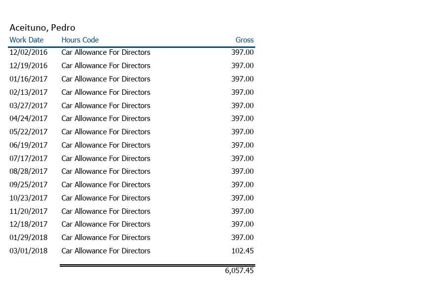 Document from Central Basin showing Aceituno’s car allowance including two payments in Dec 2016.