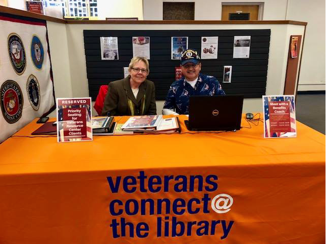 Sue Cane sits with a combat vet volunteer at the new Veterans Resource Center.