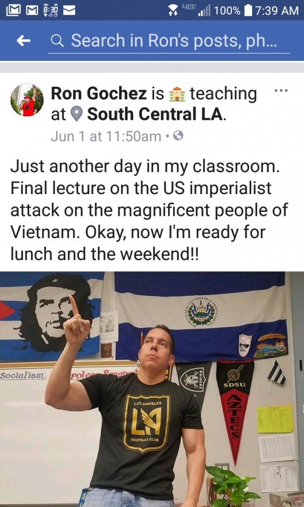 One of Lara’s main weapons is extremist Ron Gochez, who heads the Los Angeles chapter of UdB. Lara and Gochez taught together at Santee High School in Los Angeles.