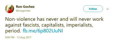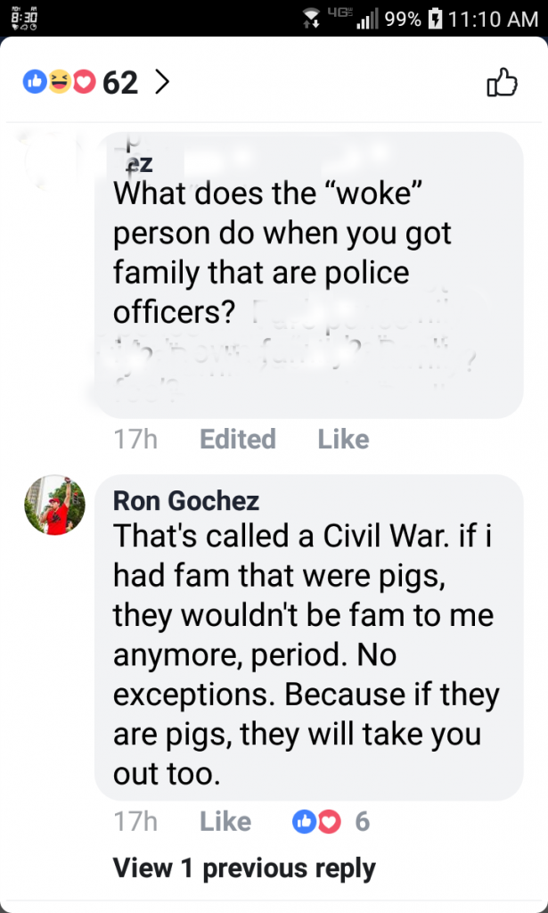 In the same vein as Greg Salcido, Gochez regularly refers to police officers as pigs and the military as a terrorist organization; social media posts can be found of Gochez advocating violence.