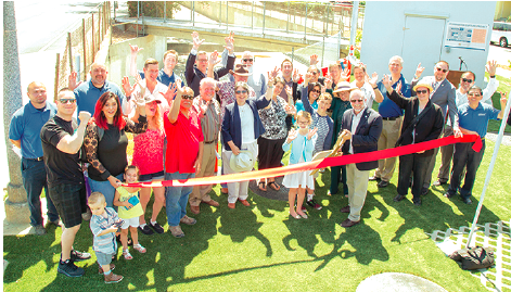 MAYOR STEVE CROFT with scissors, cuts the ribbon opening the project. With him are Vice Mayor Todd Rogers, Councilman Jeff Wood, and Downey Mayor Sean Ashton.