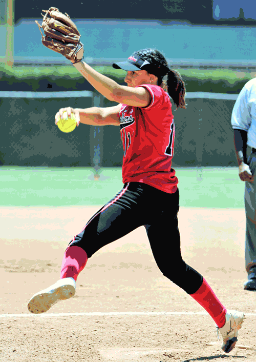 Artesia Punishers 18-Under starting pitcher Yamila Evans (San Marino High, Siena College), delivers one of her 8- pitches last Saturday against the (San Tan Valley, AZ) Mizuno Storm in the first game of the Zoom Into June Tournament. Evans gave up three hits and struck out five as the Punishers rallied for two runs in the top of the fourth inning to end up tying the Storm 2-2.