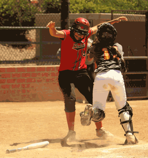 Shortstop Samantha Noriega (Carson High) of the Artesia Punishers 18-Under travel softball team avoids being tagged out by the (San Tan Valley, AZ) Mizuno Storm catcher in the top of the fourth inning in last Saturday’s Zoom Into June Tournament contest. Noriega would score on the play, a single from first baseman Jessi Alvarado (Gahr High, Manhattanville College) which tied the game at 2-2. Photo by Armando Vargas.