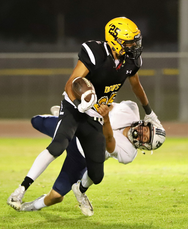 Cerritos High senior Malachi Santa Anna tries to elude a would-be tackler from Northwood High in last Thursday’s non-league contest Santa Anna would catch a three-yard touchdown pass, his lone reception of the night. But he also had a 66-yard kickoff return in the first quarter of a 51-20 Northwood victory. PHOTO BY ARMANDO VARGAS, Contributing photographer