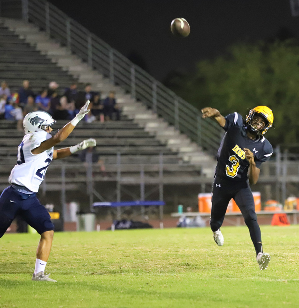 Cerritos High junior quarterback Stacy King lets off one of his 32 passes against Northwood High last Thursday night. King threw for 131 yards and a pair of touchdowns as Cerritos fell to the Timberwolves 51-20. PHOTO BY ARMANDO VARGAS, Contributing photographer.