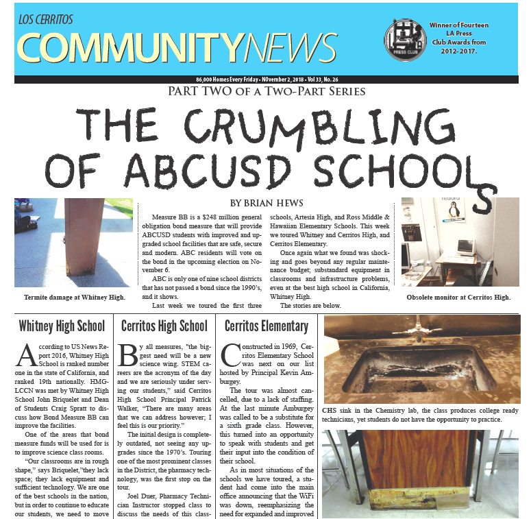 By all measures, “the biggest need will be a new science wing. STEM careers are the acronym of the day and we are seriously under serving our students,” said Cerritos High School Principal Patrick Walker, “There are many areas that we can address however; I feel this is our priority.”