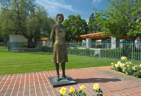 The City of Cerritos bought the Nixon property from the family in 1967, but the home was destroyed by fire in 1978. In April 1996, the Cerritos City Council approved installing a “life-size, full-body” bronze statue of Pat Nixon in the rose garden of the Cerritos Senior Center. Artist Ivan Schwartz, who had sculpted statues of 10 world leaders for the Richard Nixon Presidential Library and Museum in Yorba Linda, was selected as the statue’s sculptor. The statue was dedicated on March 1, 1997. The bricks used in the existing memorial at the site are from the original home’s fireplace and chimney.