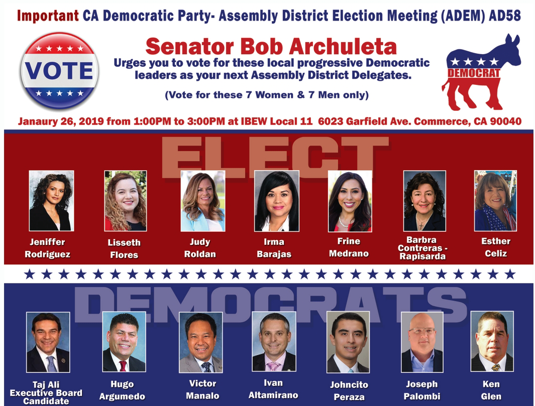 Sen. Archuleta’s slate of candidates include Commerce Councilman Ivan Altimirano, Commerce Mayor Hugo Argumedo, Montebello City Clerk Irma Barajas, former Pico Rivera Commissioner Esther Celiz, Bell Gardens Council woman Lisseth Flores, Ken Glen, former Artesia Councilman Victor Manalo, former 58thAssembly candidate Frine Medrano, Joseph Palombi, former Commerce City Council candidate Johncito Peraza, Barbra Contreras-Rapisarda, Bell Gardens Council woman Jennifer Rodriguez, Judy Roldan, and Artesia City Councilman Ali Taj. Taj is running for the E-Board.
