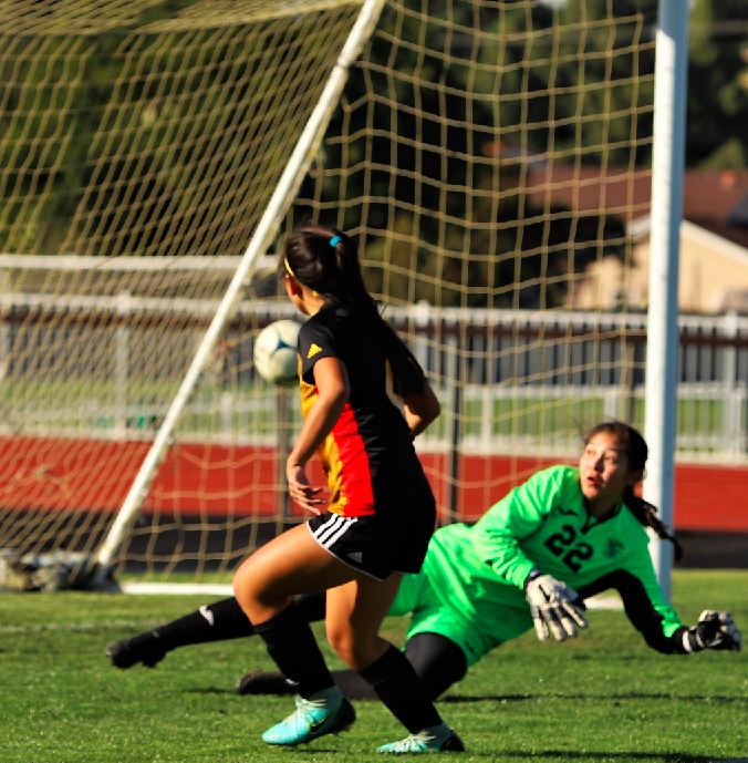 Cerritos High senior forward Erika Rizal scores her team’s lone goal in last Friday’s CIF-Southern Section Division 4 second round game against Palm Desert High. The Lady Dons, the top-ranked team in the division, fell to the unranked Aztecs 2-1 in overtime. It was Rizal’s 14th goal of the season. PHOTO BY ARMANDO VARGAS, Contributing photographer
