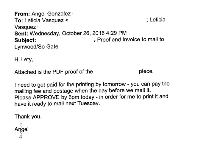 At the behest of Vasquez, Gonzales designed a second mailer and emailed a “proof” on Oct. 26, 2016 to Vasquez at 4:29 p.m. asking for approval by 6 p.m.