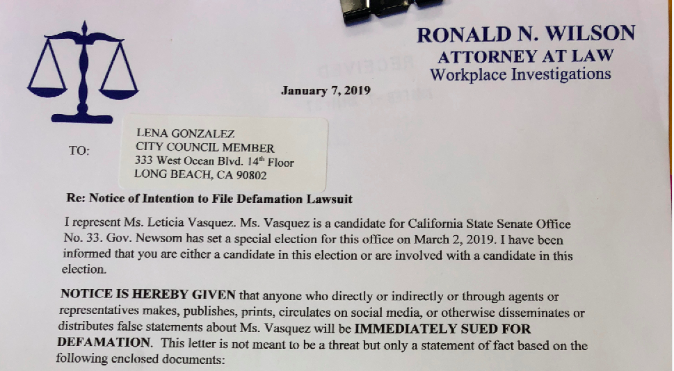The letter threatened a lawsuit if any candidates or supporters printed or published anything from the HMG-LCCN defamation lawsuit that Vasquez lost in 2017.