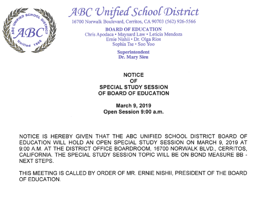 Measure BB Next Steps : ABCUSD Board Special Study Session This Saturday Mar. 9 at 9 A.M.