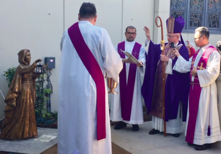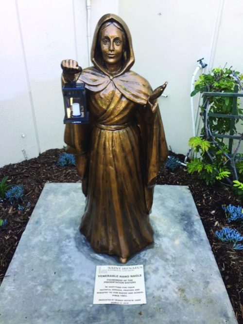 Bishop Kevin Vann dedicated and blessed a statue of the Venerable Nano Nagle on St. Patrick’s Day at St. Irenaeus Catholic Church in Cypress. Nano Nagle founded the Sisters of the Presentation of the Blessed Virgin Mary in Ireland and was a pioneer in Catholic education. She was born in 1718 in Cork, Ireland and died on April 26, 1784. Nano Nagle was declared venerable on Oct. 31, 2013 by Pope Francis. The celebration also honored the loving service of the Presentation Sisters at St. Irenaeus.