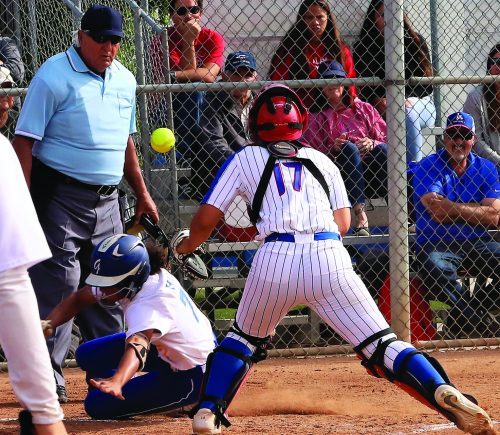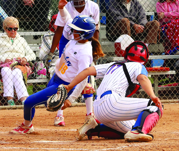Gahr High freshman courtesy runner Mikala Huskey is caught stealing home in the top of the sixth inning against Los Alamitos High in this past Tuesday’s CIF-Southern Section Division 1 second round game. However, the Lady Gladiators already had a 4-0 lead, which would be the final score. Gahr improved to 21-5 on the season. PHOTO BY ARMANDO VARGAS, Contributing photographer
