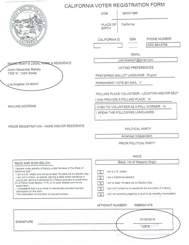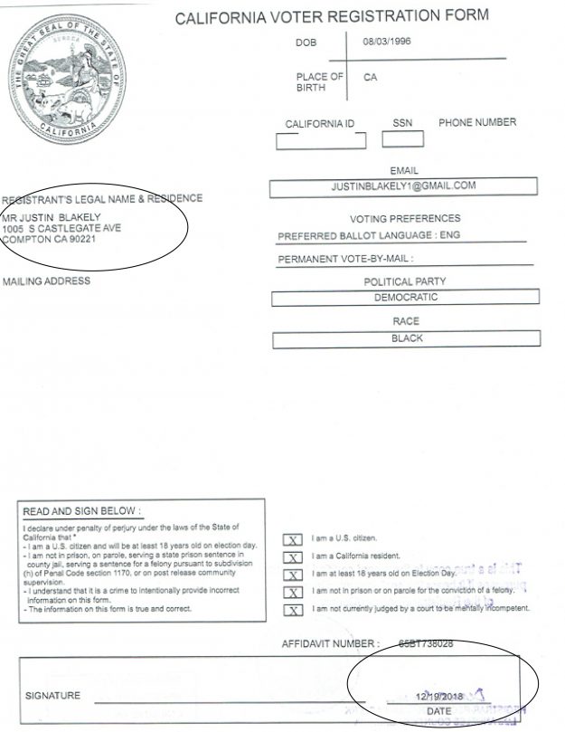 The document is evidence that Blakely did not register to vote until he was twenty years-old (7/30/2016) and living at the home on 124th street. Sources tell HMG-LCCN that Blakely attended California State University at Dominguez Hills which is very close to the 124th street residence.
