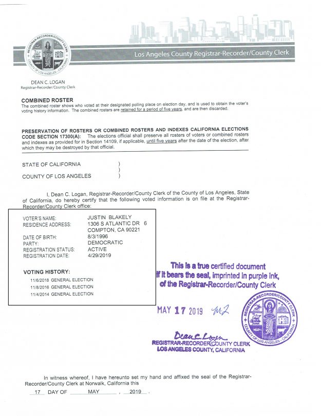 Hews Media Group-Los Cerritos Community News has obtained documents from the Norwalk-Registrar Recorder’s Office that show Compton City Council Candidate Justin Blakely only recently moved and registered to vote in the city of Compton.