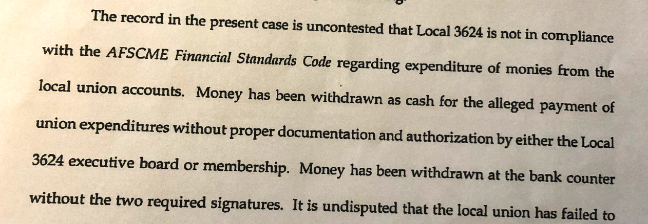 “It is uncontested that local 3624 is not in compliance with the AFSCME Financial Standards Code regarding expenditure of monies. Money has been withdrawn as cash for the alleged payment of union expenditures without proper documentation and authorization by either the local executive board or membership.”