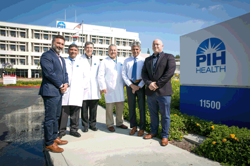 Standing in front of PIH Health Hospital – Downey, PIH Health Physicians leaders welcome new physicians to the PIH Health network. Pictured (l-r) are Roberto Madrid MD, PIH Health Physicians vice president of medical operations; Pinal Doshi MD; Jerry Floro MD; Edwardo Tellez MD; Sanat Patel MD; and Andrew Zwers, PIH Health Physicians vice president of group operations.