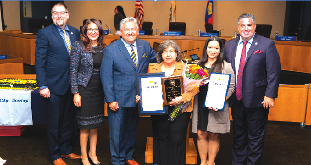 JOSEPHINA HERNANDEZ, center, holds her recognition plaque. With her is, from (l-r), Councilman Sean Ashton, Mayor Pro Tem Blanca Pacheco, Hernandez, Recreation Supervisor Monica Ortiz and Councilman Alex Saab. Photo courtesy city of Downey.