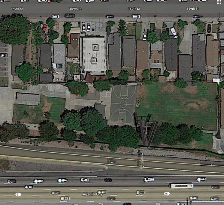 A.J.Padelford Park, center, with 169th street to the north and the 91 freeway to the south