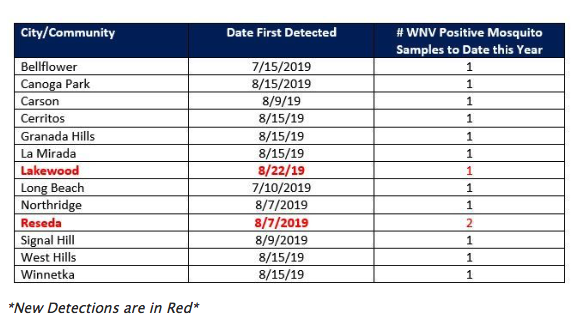 LOS ANGELES (August 30, 2019) – The Greater Los Angeles County Vector Control District (GLACVCD / District) reminds residents to take a few simple steps to prevent mosquito bites this holiday weekend. Mosquitoes infected with West Nile virus have been collected from 13 cities in the District so far in 2019. The new positive samples were collected from areas of Lakewood and Reseda.