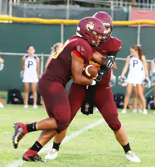 Valley Christian High sophomore quarterback Colin Abrahams hands off to senior running back Jarvis Hudnall in last Friday night’s contest against Portola High. Hudnall was limited to 36 yards on nine carries as the Defenders were doubled up by the Bulldogs 34-17. V.C. fell to 1-2 on the season. PHOTO BY ARMANDO VARGAS, Contributing photographer.