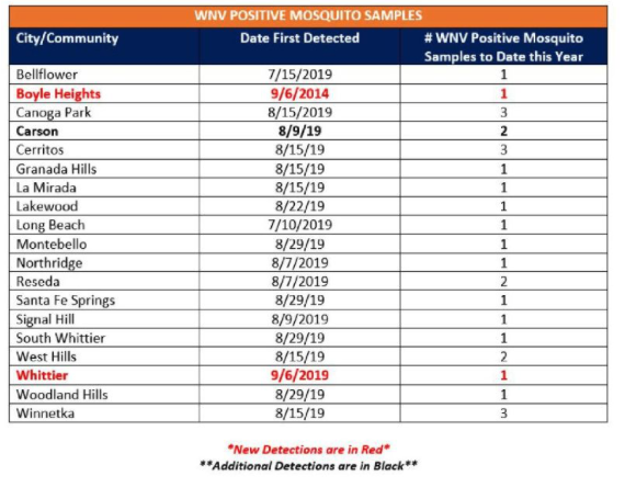 LOS ANGELES (September 13, 2019) – The Greater Los Angeles County Vector Control District (GLACVCD / District) has confirmed three additional mosquito samples positive for West Nile virus (WNV). This brings the total number of samples positive for the virus within the district’s service area to 28 this year. Positive samples were collected in two new areas: Boyle Heights and Whittier.