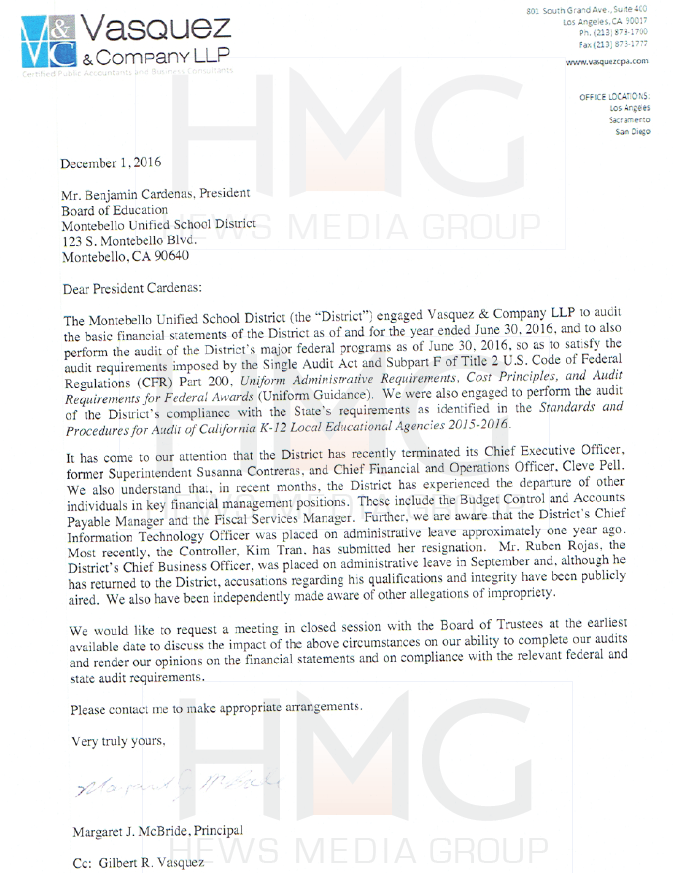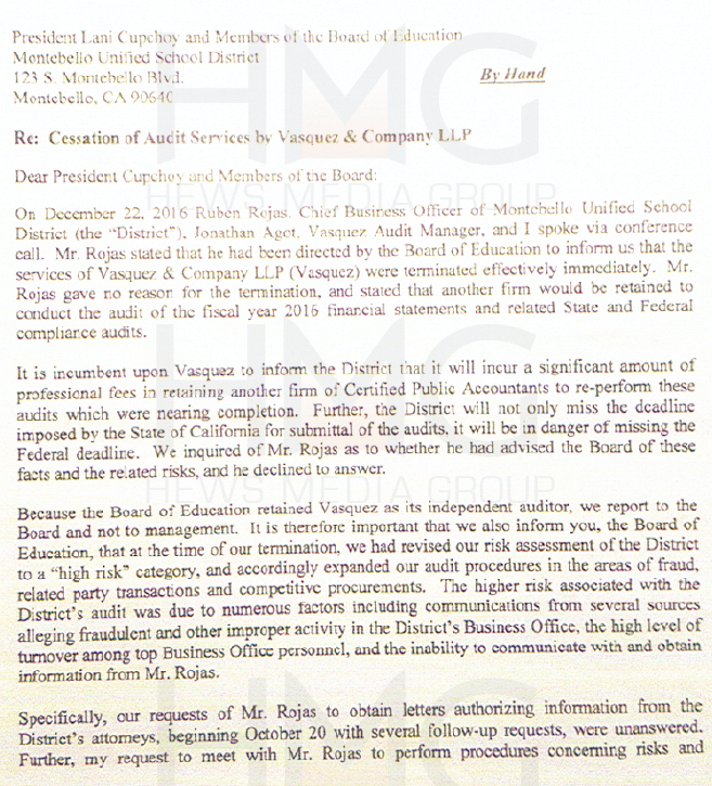 At the time, HMG-LCCN has exclusively obtained letters from the accounting firm of Vasquez and Company LLP (Vasquez), the firm retained to audit the school district, that warned of an ongoing financial scandal of immense proportions being guided by Rojas.